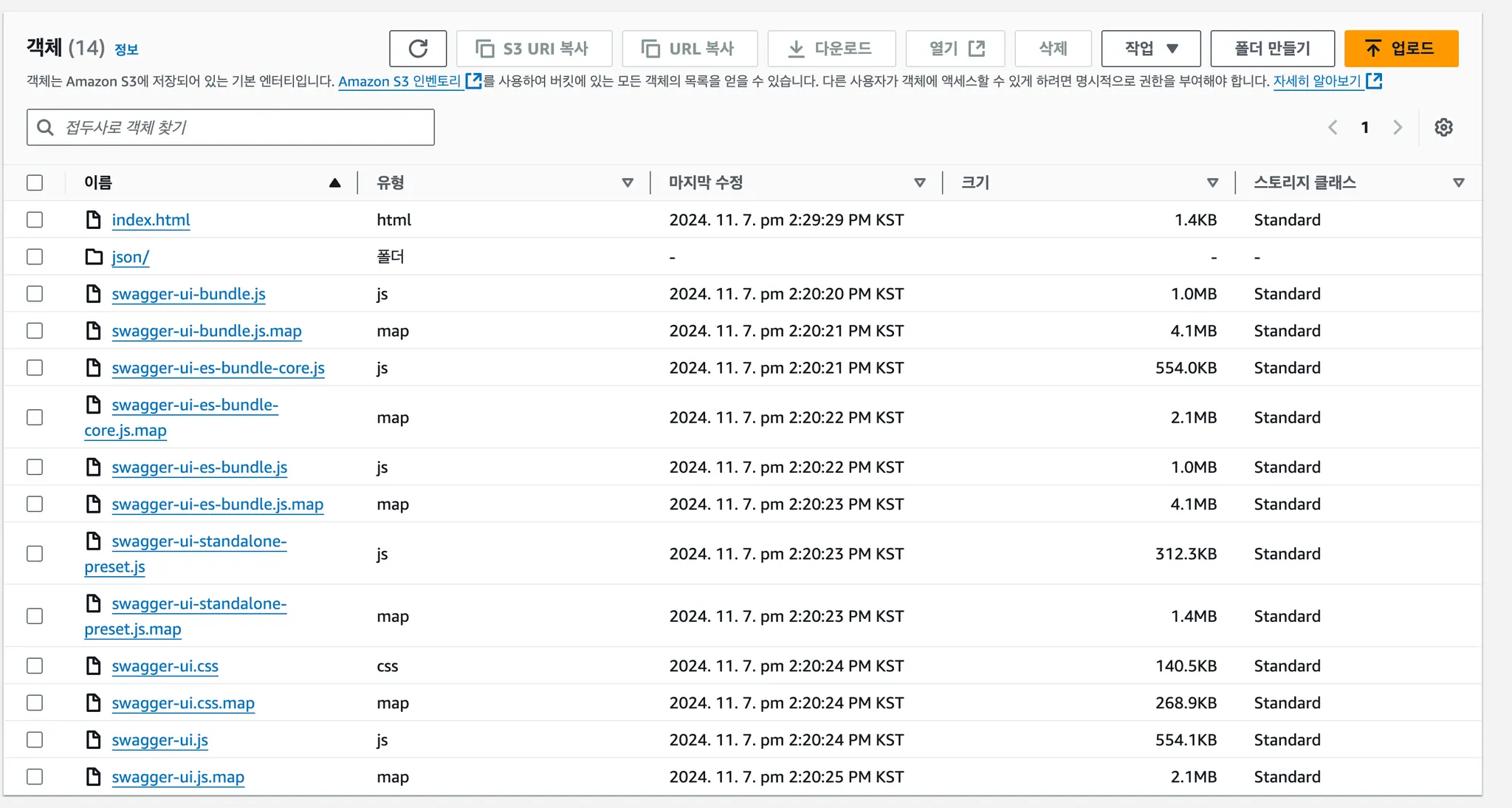GitAction을 활용한 OpenAPI Spec 자동 배포 및 Swagger UI 업데이트 과정(1)위에 글에서는 EC2로 배포하는작업을 했다. 하지만 그보다 더 좋은방법이 있어서 작업을 바꿔보았다.S3에서 swagger-ui를 배포하는방식이다. S3에서 html을 올리면접근이 가능하니까 swagger용 index.html를 만들어준다.( swagger용 html은 s3에 있는 url-mapper.json을 읽도록 되어있다. ) index.html이 준비되었다면 S3에 업로드 해준다.업로드가 되었다면 url을 복사하여 주소창에 입력해보면 화면을 볼 수있다. 이제 json 폴더를 만들어서 yaml을 → url-mapper.json 로 만들어주는 작업을 해야된다.gitAction에서 사용하..